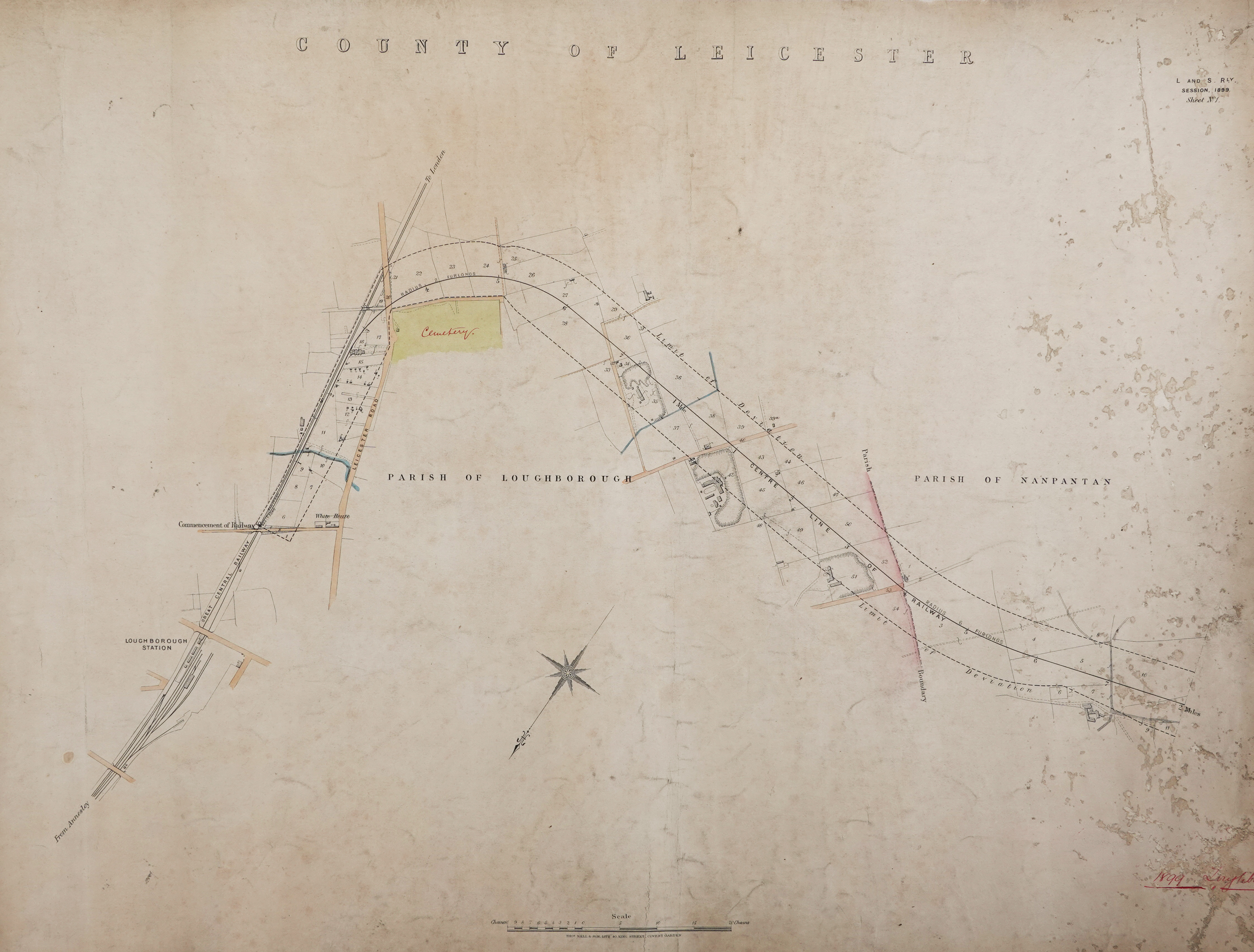 Lane. From this point it runs alongside the trunk line as far as Shelthorpe Cottage, whence it turns sharply to the west, cuts across the Leicester main road, and proceeds round the top of the cemetery. Passing through