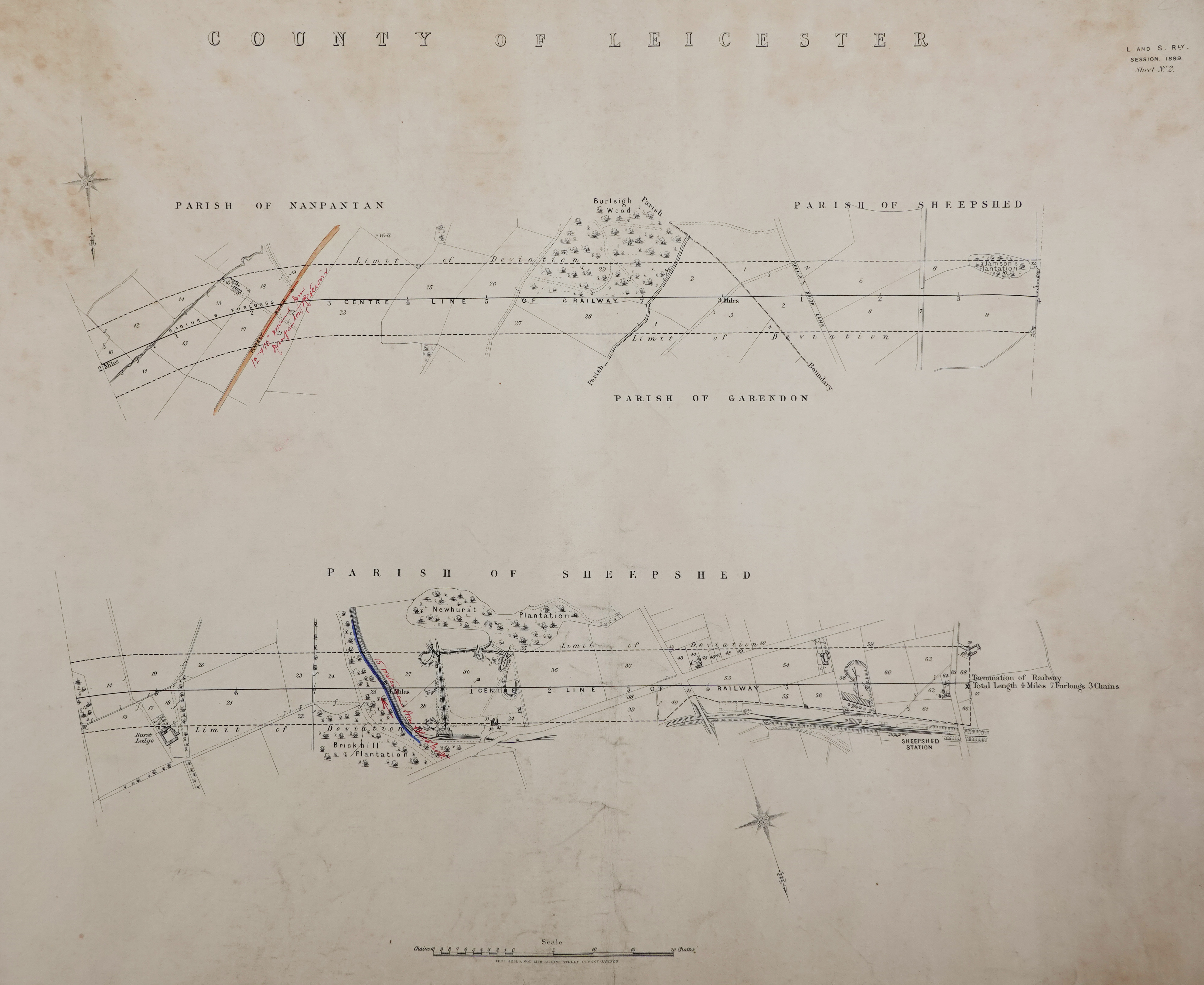 In this section are scans of four maps, 640mm x 560mm, of a proposed 4 miles branch line from Loughborough Central Station to the nearby village of Sheepshed [sic] (an old version of the modern name of Shepshed). The maps were produced for putting before parliament with the private ‘Loughborough And Sheepshed Railway Bill’. Hansard of Tuesday 6 June 1899 reported that the bill had received the Royal Assent, but there is no record of any building work for this railway being carried out and the consent was apparently allowed to lapse.